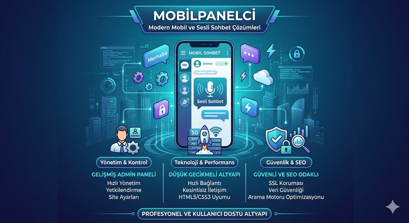 Mobilpanelci, sesli ve görüntülü sohbet platformları için modern, mobil uyumlu ve yüksek performanslı panel çözümleri sunan bir altyapı sağlayıcısıdır.